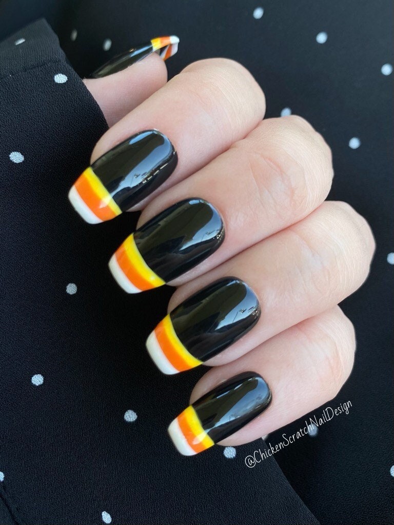 Black and orange are the traditional Halloween colors. Liven them up with a candy corn nail on each hand.