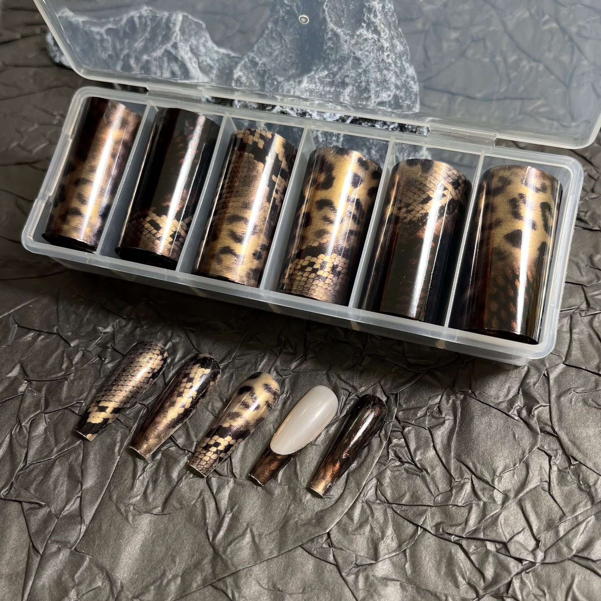 Transparent transfer foils with clear backing, allowing you to see your nail and align the foil art with precision. Perfect for full transfer, partial transfer (allow your base color shines through or add different nail design), or mixed transfer (layering different design of nail foil together).