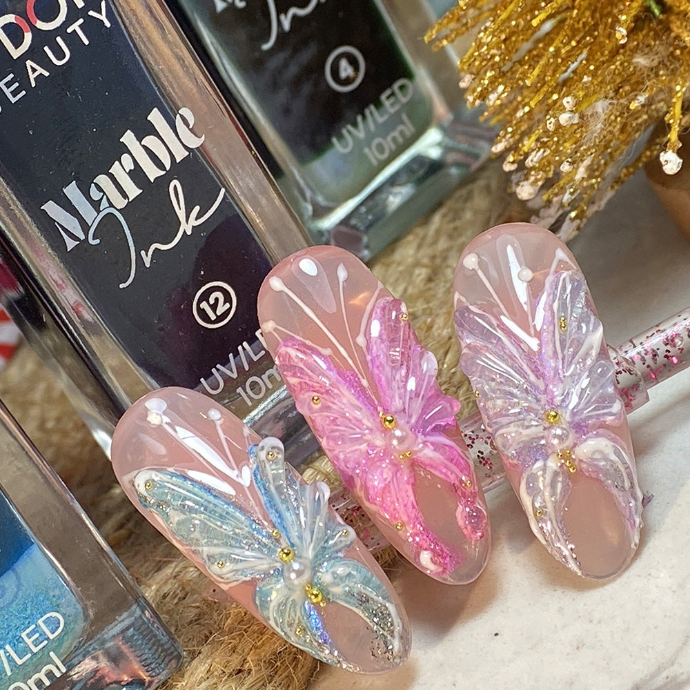 Elevate your nail game with Marble Ink - a high‑pigment, ultra‑light liner ink formulated for quick‑drying, watercolor‑style designs that change with your base color. On something light, the effect glistens with delicate iridescence. On a dark base, the shimmer intensifies. Ideal for marbling, fine line work, veining, abstract streaks, and artistic interplay of color and light.