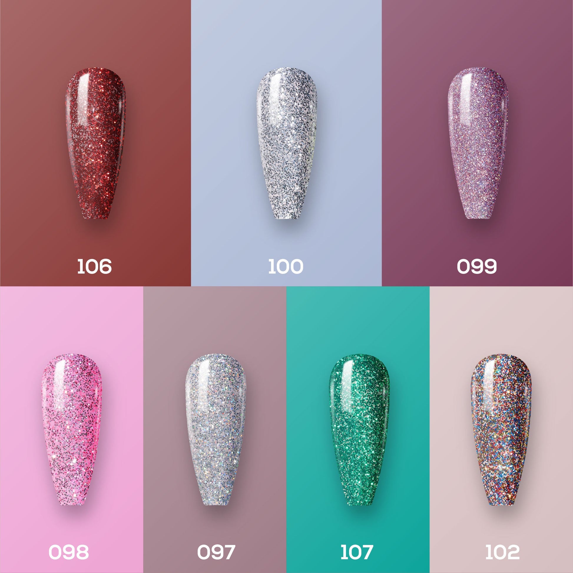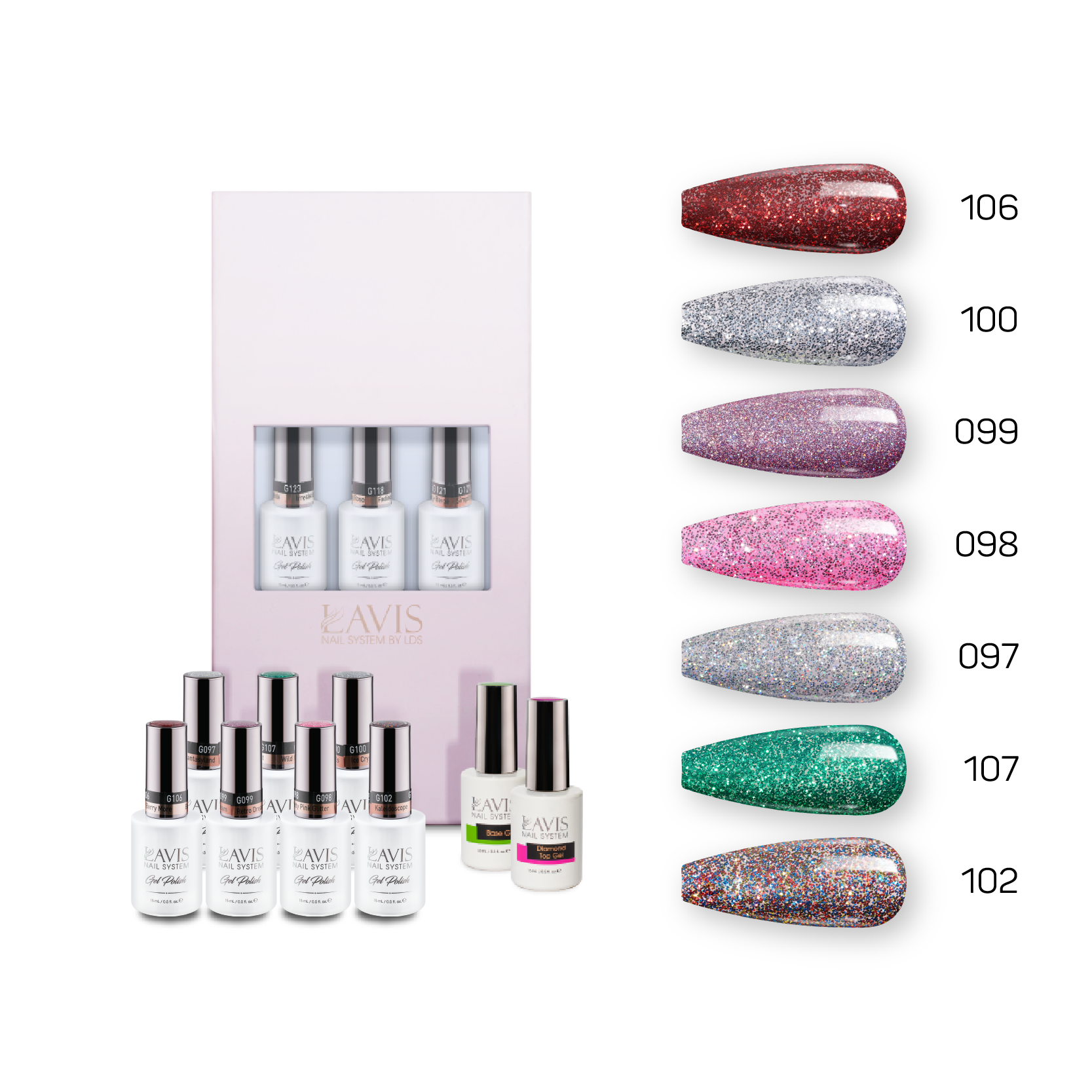 Lavis Holiday Collection: 7 Gel Polishes, 1 Base Gel, 1 Top Gel - Set 21 - 106, 100, 099, 098, 097, 107, 102 + BT